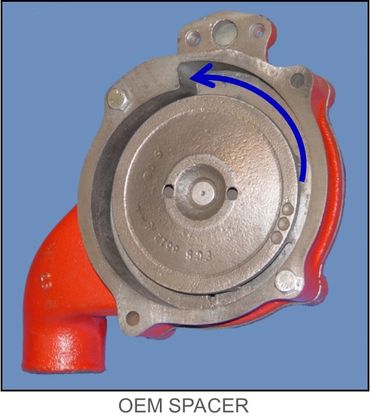 In this illustration, an OEM spacer is in-place on a timing chain cover with a water pump in relative position above. With the water pump installed on the spacer, the center of the impeller vanes is approximately at the point of the flow arrow. Centrifugal force keeps the fastest moving coolant to the outer circumference of the spacer chamber. Coolant departs the impeller vanes and impacts the offset portion of the interior surface, perpendicular to the surface. The spacer does not channel the coolant to the volute opening in the timing chain cover.