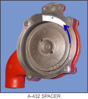 Here, a patented A-432 spacer is in-place on a timing chain cover. With the water pump mounted on the front of the A-432 spacer, again, the center of the impeller vanes is approximately at the point of the flow arrow, and centrifugal force keeps the fastest moving coolant to the outer circumference of the spacer chamber. Coolant departs the impeller vanes and contacts the volute extension at approximately a 30-degree angle. The volute extension channels the coolant flow rearward into the volute opening, reducing turbulence and increasing flow. And the A-432 is cast iron with the same external contours and sand cast finish as the OEM version. A-432 spacer